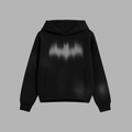 The front features a bold spray-fade Bat emblem inspired by Gotham’s gritty atmosphere, creating a striking contrast against the deep black fabric. The washed, slightly distressed finish — complete with intentional worn-in holes - adds texture and depth, giving each hoodie a unique, battle-tested character.