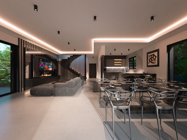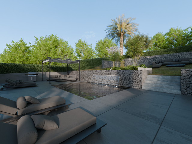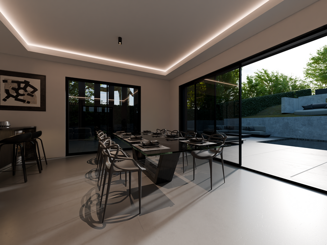 The living room is a 61.5 sqm open space with direct access to the pool area.