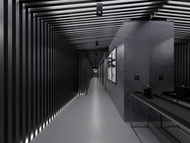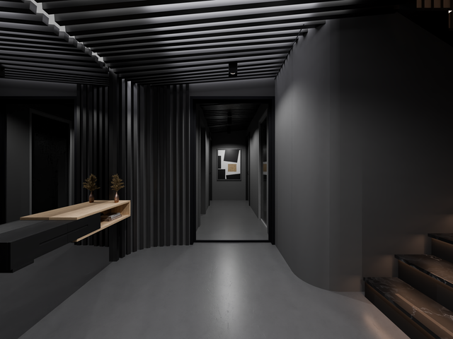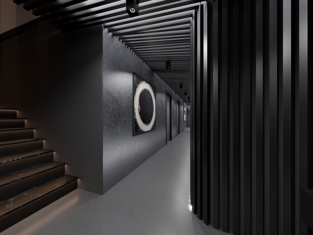 A minimalist hallway and staircase with clean lines and subtle