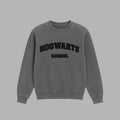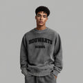 Le sweater Hogwarts School présente une broderie chenille de style universitaire sur le devant, en gris délavé, qui évoque l’esprit des sweatshirts classiques — réinterprété avec le minimalisme sombre et élégant de Blvck.