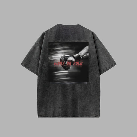 Crafted from premium heavyweight cotton with a washed, vintage-inspired finish, the tee offers a structured oversized fit while remaining breathable and comfortable. The front is clean and understated, featuring tonal UFC and Blvck Paris logos. On the back, a bold graphic of a clenched fist in motion is stamped with the phrase “FIGHT OR FOLD” — a fearless statement of determination and resilience.