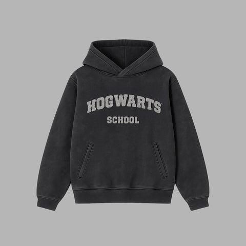 The Hogwarts School Hoodie features a bold collegiate-style front graphic in a washed grey print, designed to evoke the spirit of classic university sweatshirts — but with Blvck’s signature moody minimalism. The garment-dyed vintage black finish gives it a worn-in feel, while the subtle Harry Potter x Blvck rubber patch on the upper back adds a refined final touch.